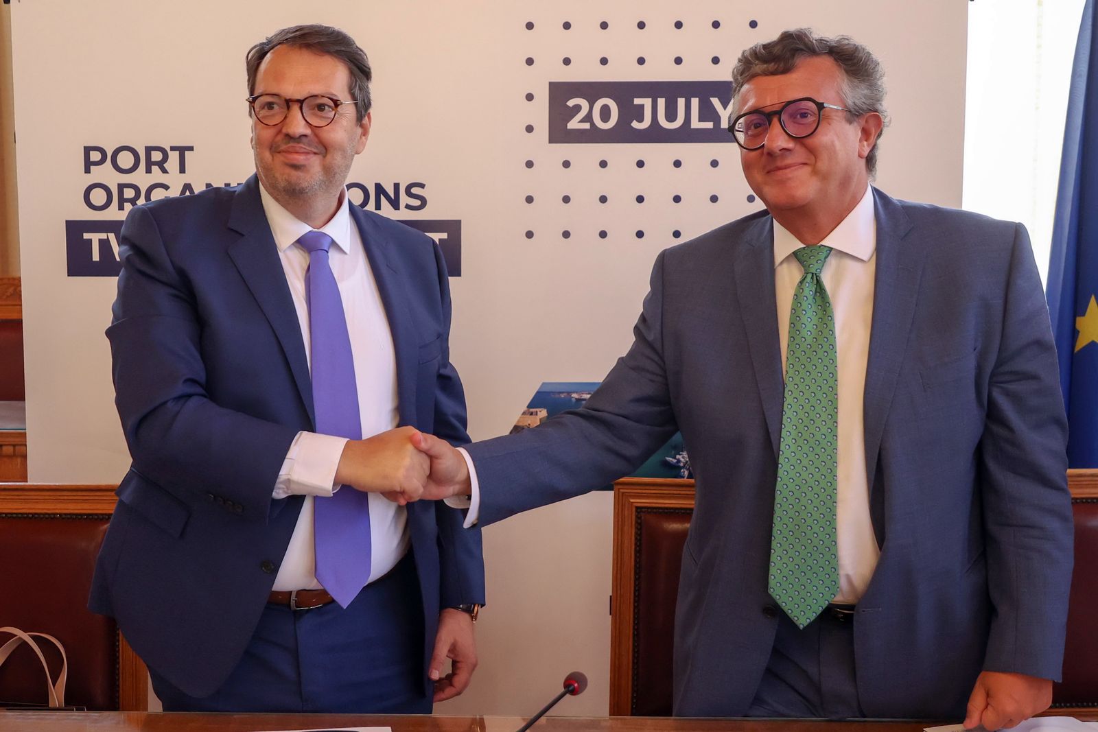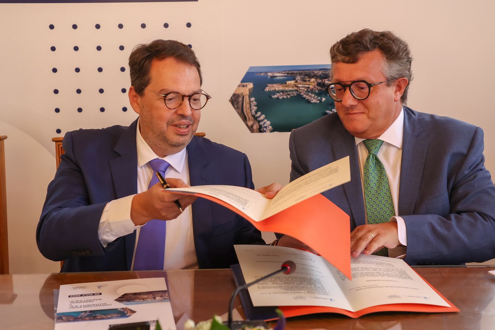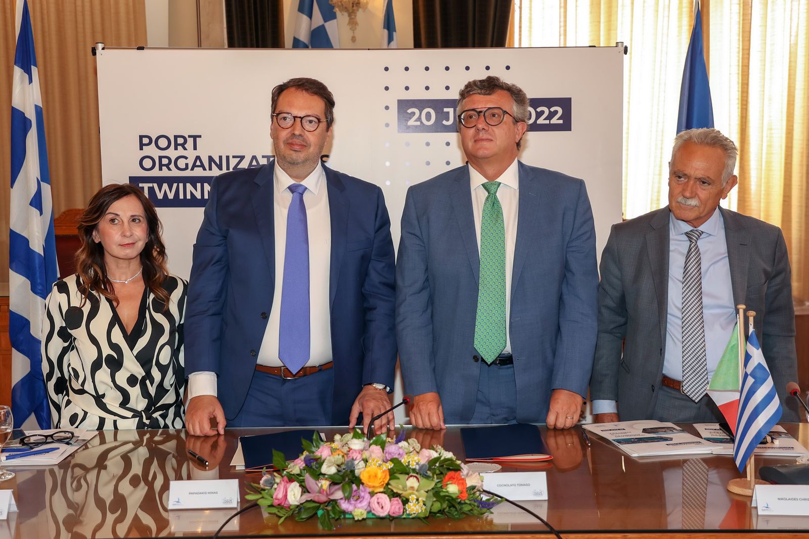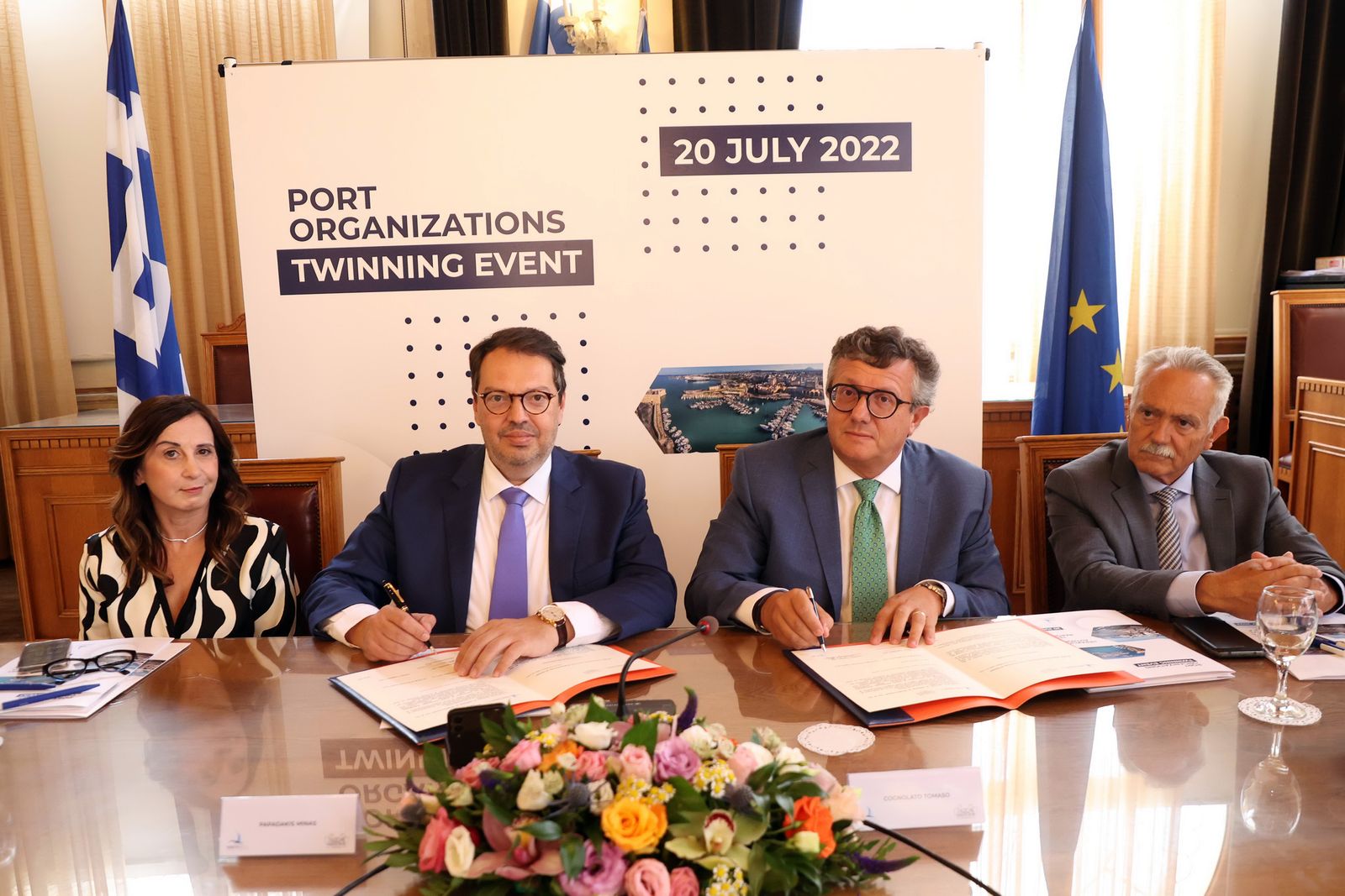 The Managing Director of the Napoli Terminal, Mr. Tomaso Cognolato, and the Professor of University of Napoli Parthenope Ms. Assunta Di Vaio, were welcomed on Wednesday, July 20, 2022, at the main building of OLI, by the Managing Director of OLI, Mr. Minas Papadakis, the President Mr. Ioannis Vardavas and members of the Administration of the Port of Heraklion Organization where a working meeting with specific agenda was made. Then following the ceremony schedule, the Managing Director of OLI Mr. Minas Papadakis accompanied the Italian delegation to the Historical Building of the Municipality of Heraklion where the Twinning Protocol was co-signed and ratified by the Managing Director Mr. Minas Papadakis and by the Managing Director of Napoli Terminal Mr. Tomaso Cognolato, which is an outreach initiative, opening a new chapter in the history of friendship and further cooperation between the two Ports.